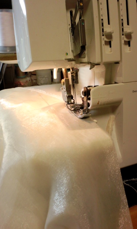 光沢のある柔らかいタイプのオーガンジーを袖の部分だけ使おうと思うんやけど、なかなか扱いが難しい。糸調子を通常の極限まで緩めてやっと縫える…。