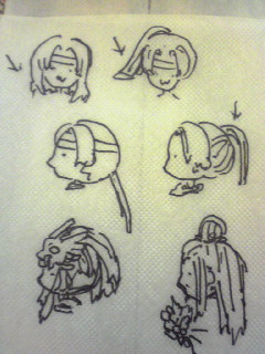 くだらない萌え話中にRちゃんが絵を描いてくれたよ。備え付けのペーパーに。これだからオタ(ry)